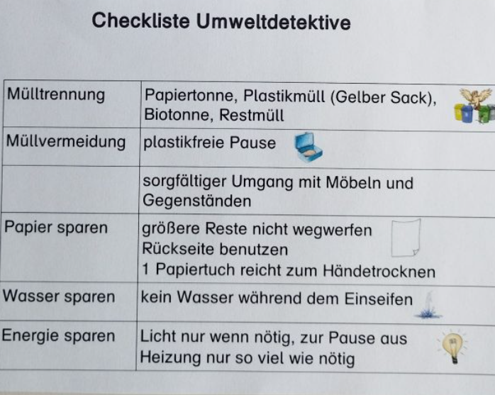 Die Kinder machen sich schon das ganze Schuljahr über Gedanken zum Thema Umwelt und u.a. dazu, wie wir an der Schule CO2 einsparen können. Um darauf in den einzelnen Klassen ein besonderes Auge zu haben, wurden vor Kurzem Umweltdetektive ernannt. Sie sind für verschiedene Bereiche zuständig, die unsere Umwelt betreffen: Mülltrennung und -entsorgung, plastikfreie Pause, Energie (Licht, Heizung), schonender Umgang mit Wasser, Papier,… So kann es schon mal vorkommen, dass die Kinder mit dem Hausmeister sprechen und ihn darum bitten, die Heizung im Gang niedriger zu stellen, da es dort nicht so warm sein muss.