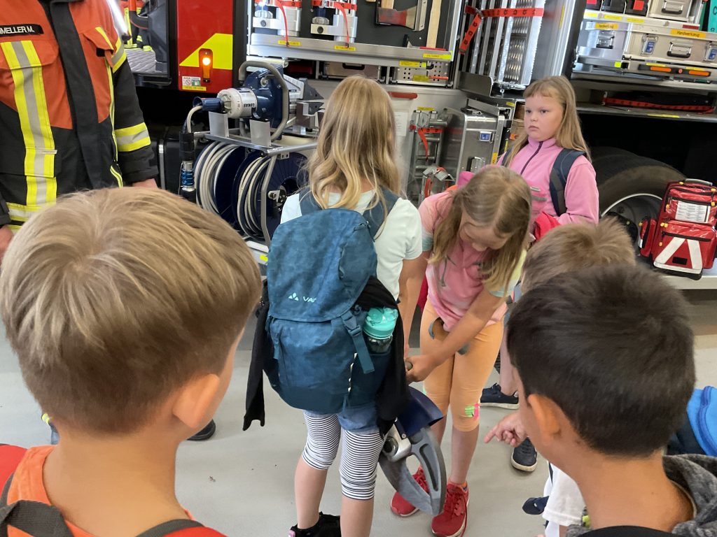 Der heutige Projekttag startete für die dritten Klassen bei der Feuerwehr. Dort wurden den Schüler*innen die Einsatzfahrzeuge und Verhaltensmaßnahmen im Falle eines Brandes geschildert.