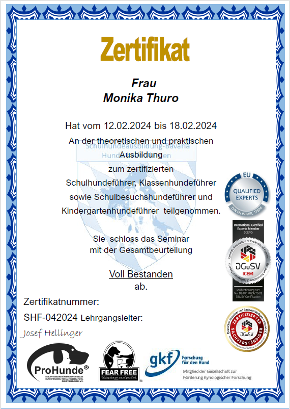 Nach Durchlaufen einer speziellen Schulhundeausbildung ist sie mit abschließender Prüfung berechtigt, zur pädagogischen Unterstützung im Unterricht eingesetzt zu werden.