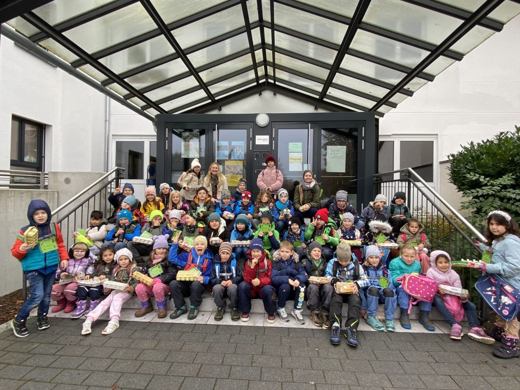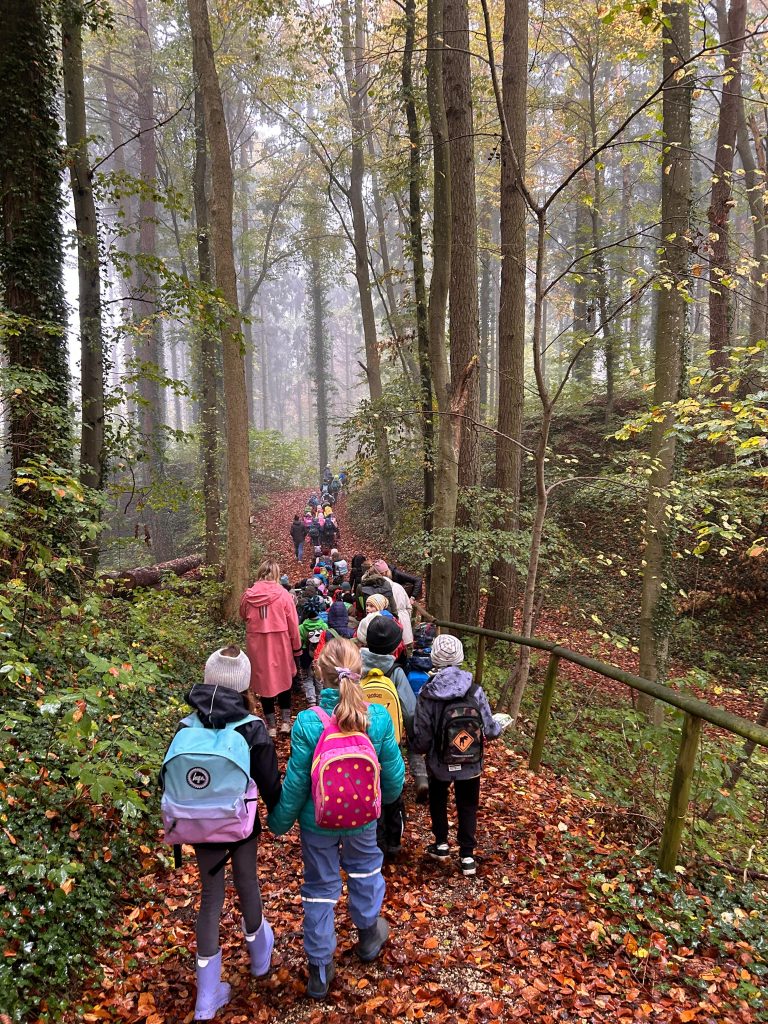 Im Oktober machten die ersten Klassen eine spannende Schnitzeljagd. Sie halfen dem Eichhörnchen Willi Winzig, seine gestohlenen Nüsse wieder zu finden. Zum Glück hatte der Dieb Spuren (Nüsse und Hinweise) hinterlassen und so konnten die Kinder ihn bis zur Waldkapelle verfolgen. Es stellte sich heraus, dass der Bruder des Eichhörnchens sich einen Scherz erlaubt hatte. Als Belohnung für die fleißigen Spurensucher gab es noch einen Goldschatz.