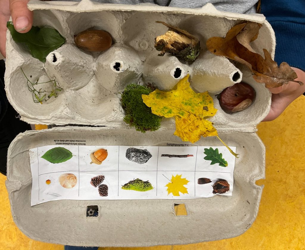 bekamen die Kinder eine weitere Suchaufgabe: In Form eines „Waldbingos“ sollten sie verschiedene Naturmaterialien suchen und in einem Eierkarton aufbewahren. Dieser wurde nach der Rückkehr im Klassenzimmer begutachtet.