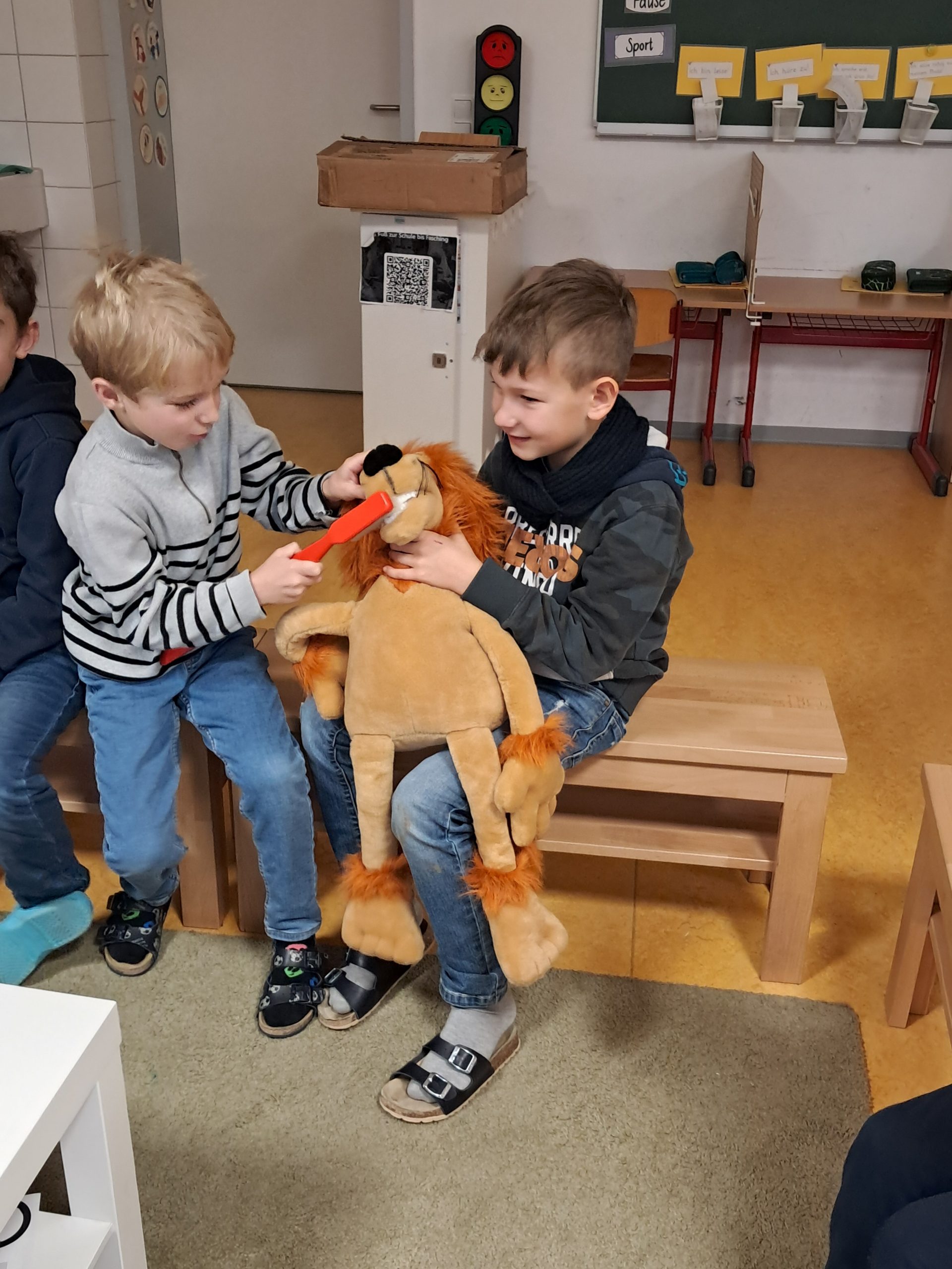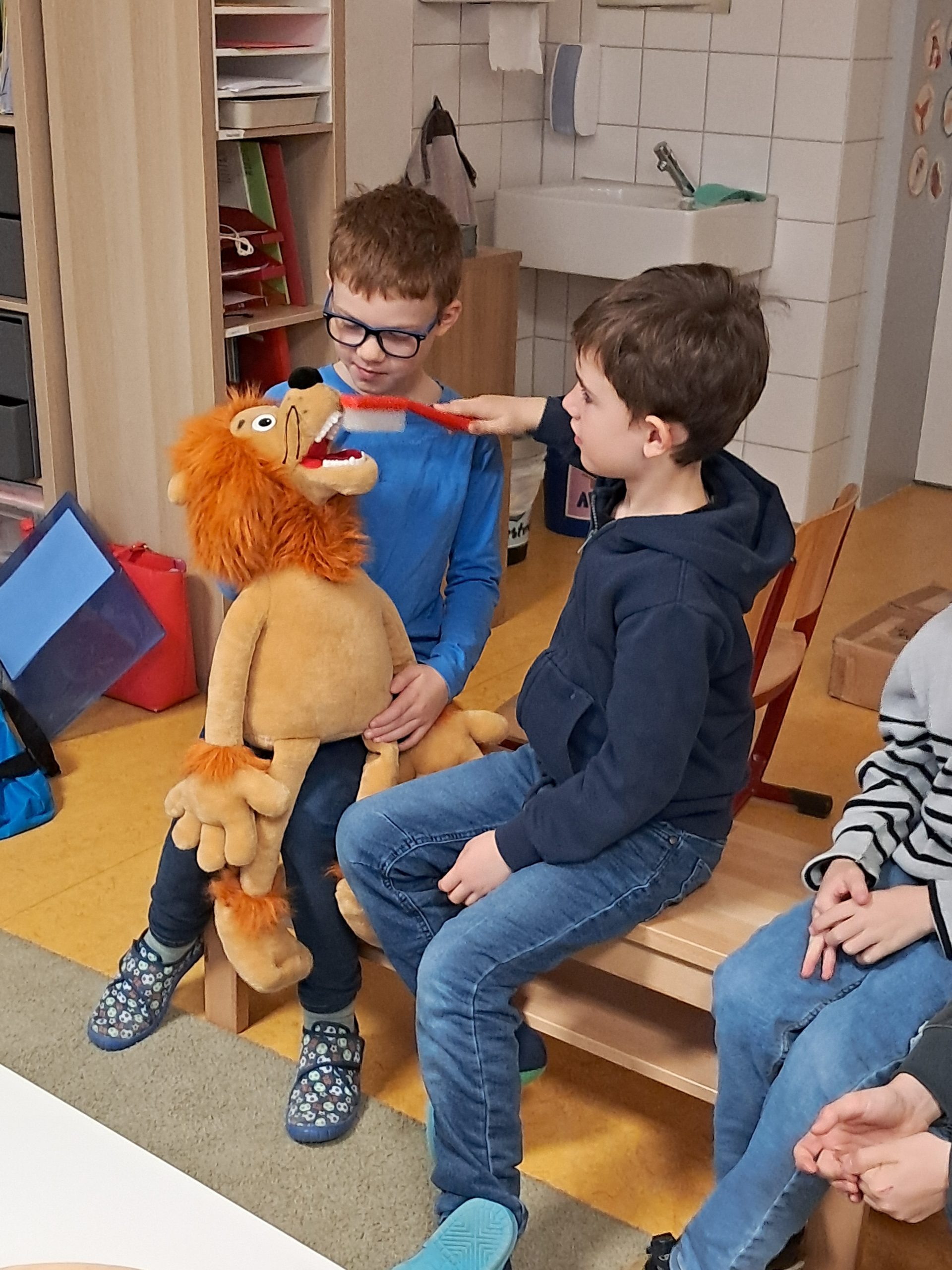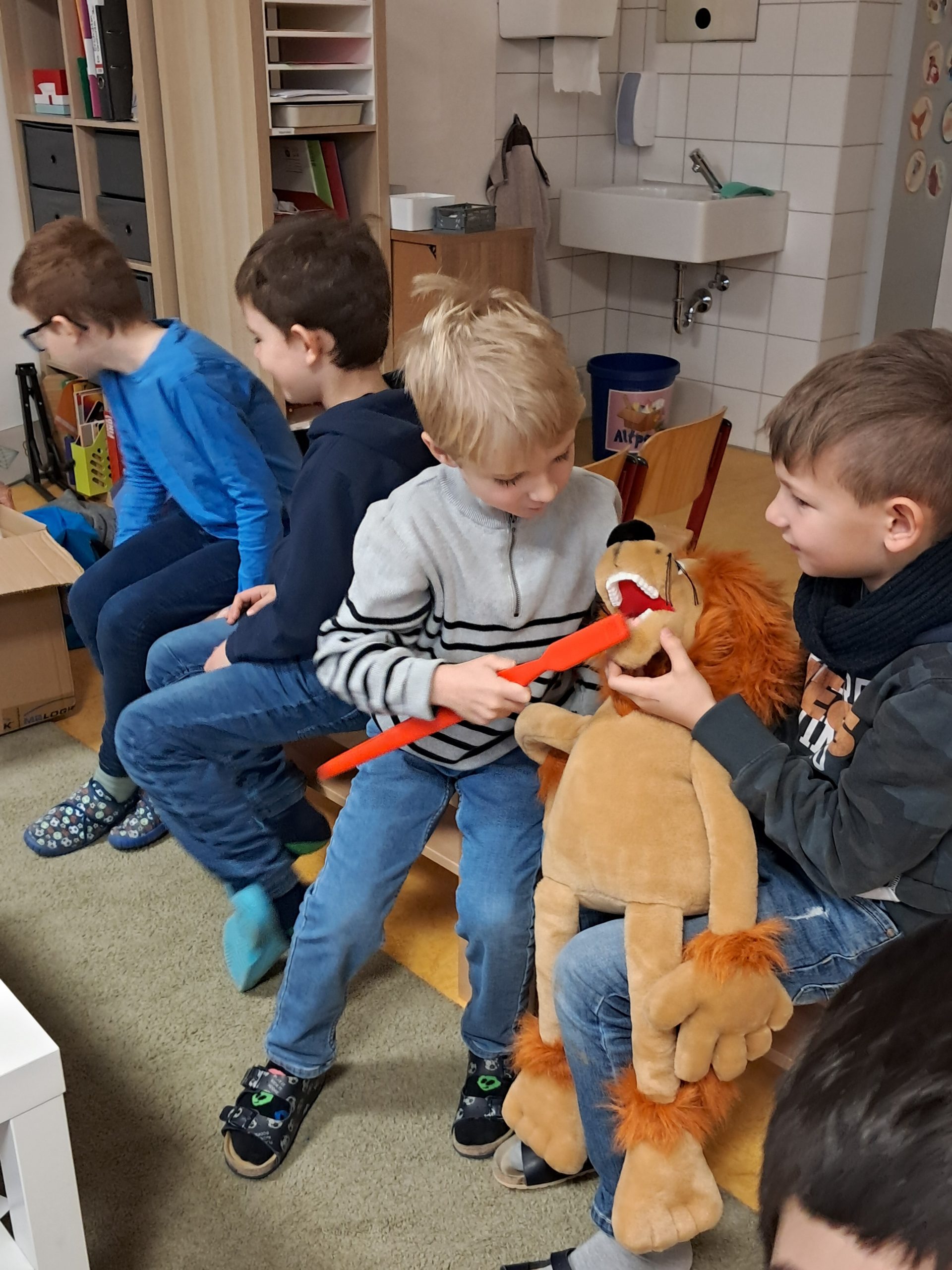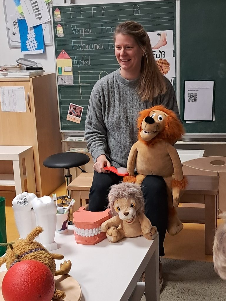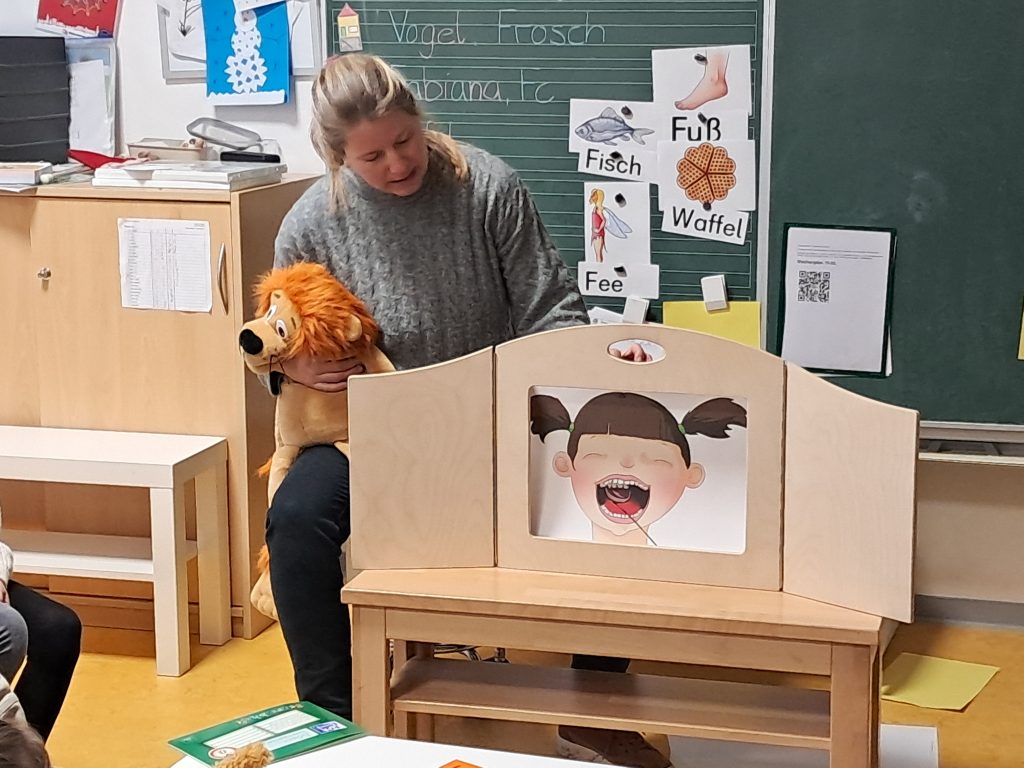 Am 11.02. besuchte die Zahnärztin Frau Dr. Tyrrell der Bayerischen LandesArbeitsGemeinschaft Zahngesundheit e.V. LAGZ die ersten Klassen. Begleitet wurde sie vom Löwen Dentulus, der ein echter Zähne-Profi ist. Als erstes ging es per Kartentheater auf die Reise, bei der Dentulus gemeinsam mit seinem Freund, dem Fuchs sich bei einem Besuch in einer Zahnarztpraxis das Zahnputz-Werkzeug aus der Nähe ansah und beobachtete, wie man es korrekt einsetzt.