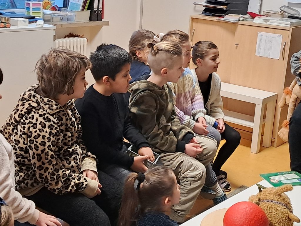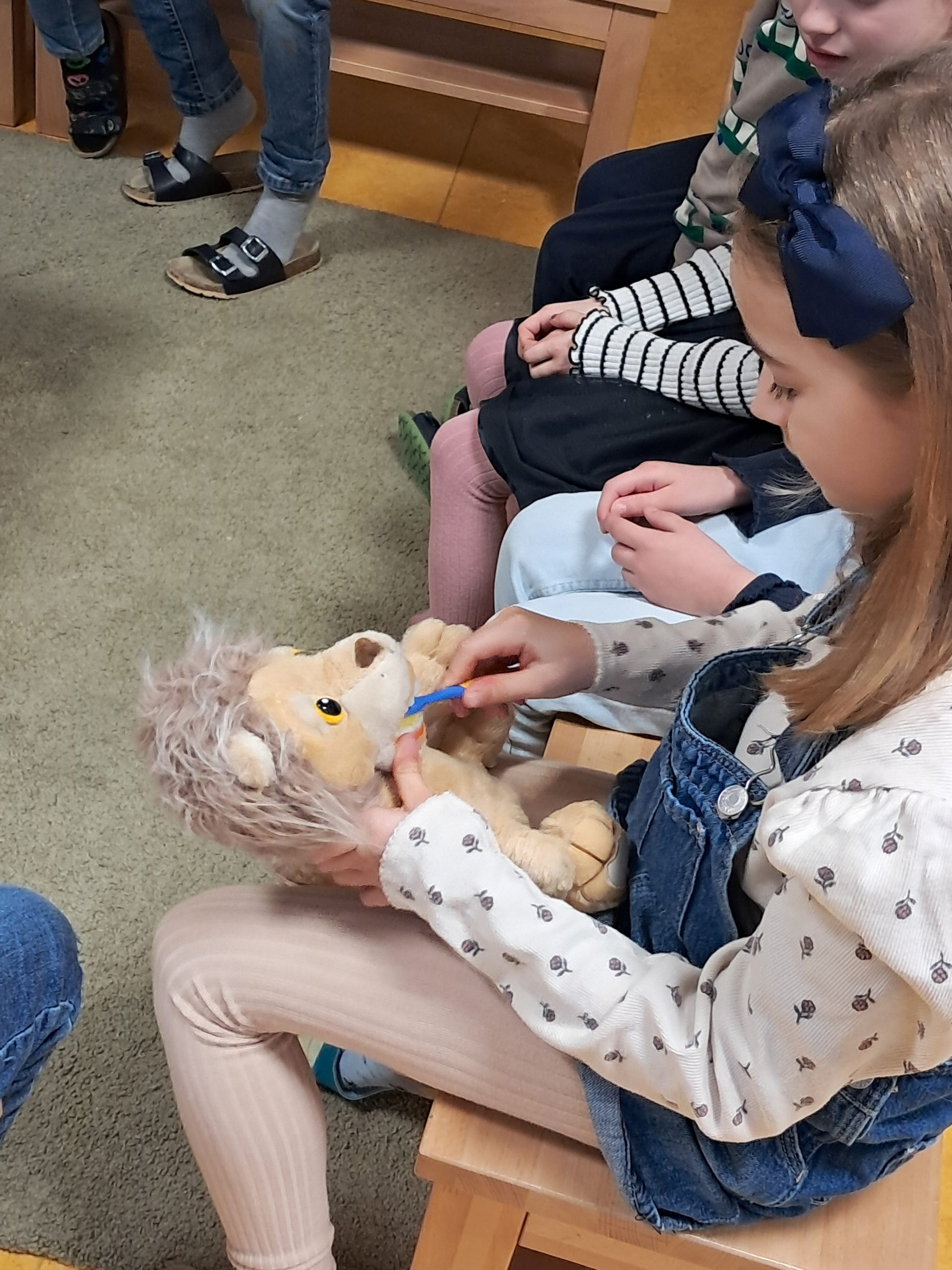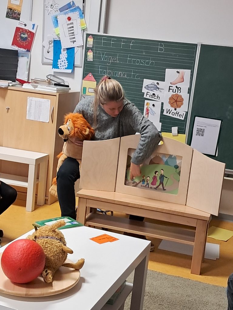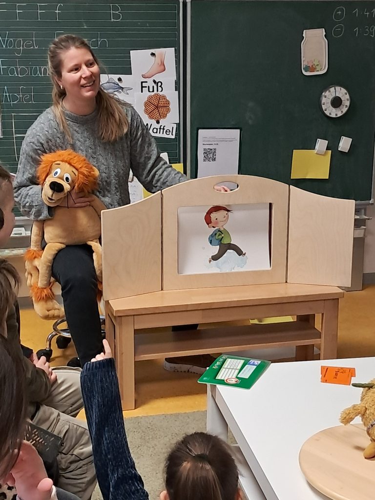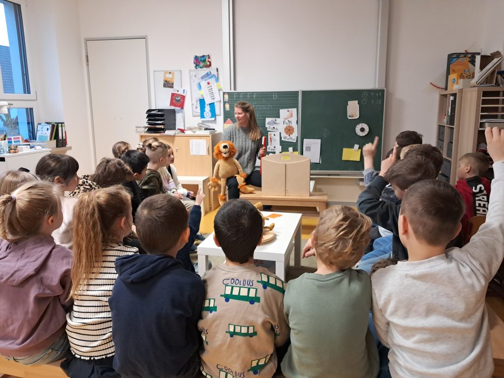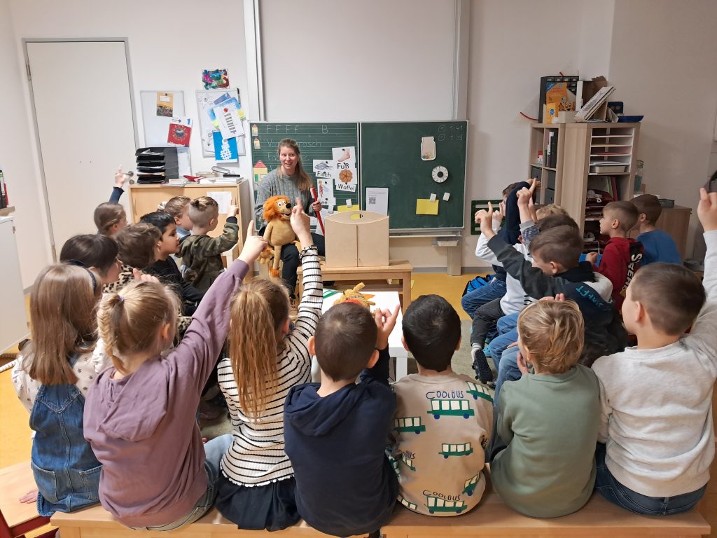 Am 11.02. besuchte die Zahnärztin Frau Dr. Tyrrell der Bayerischen LandesArbeitsGemeinschaft Zahngesundheit e.V. LAGZ die ersten Klassen. Begleitet wurde sie vom Löwen Dentulus, der ein echter Zähne-Profi ist. Als erstes ging es per Kartentheater auf die Reise, bei der Dentulus gemeinsam mit seinem Freund, dem Fuchs sich bei einem Besuch in einer Zahnarztpraxis das Zahnputz-Werkzeug aus der Nähe ansah und beobachtete, wie man es korrekt einsetzt.