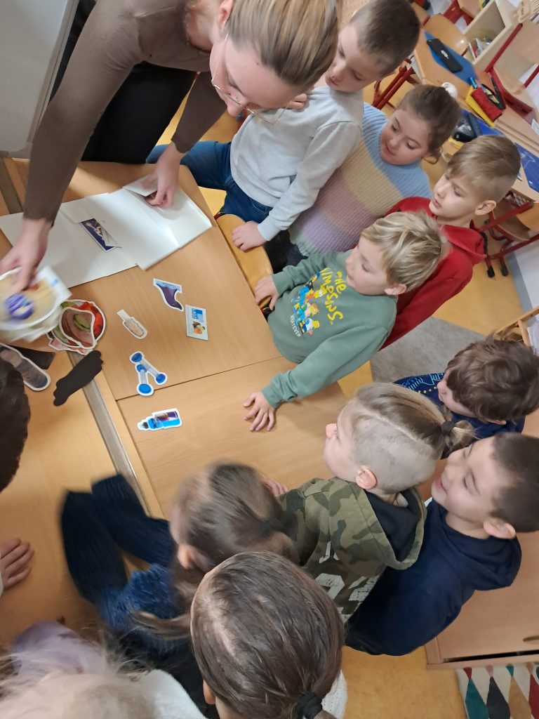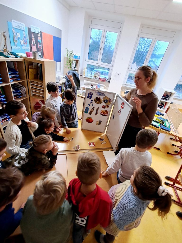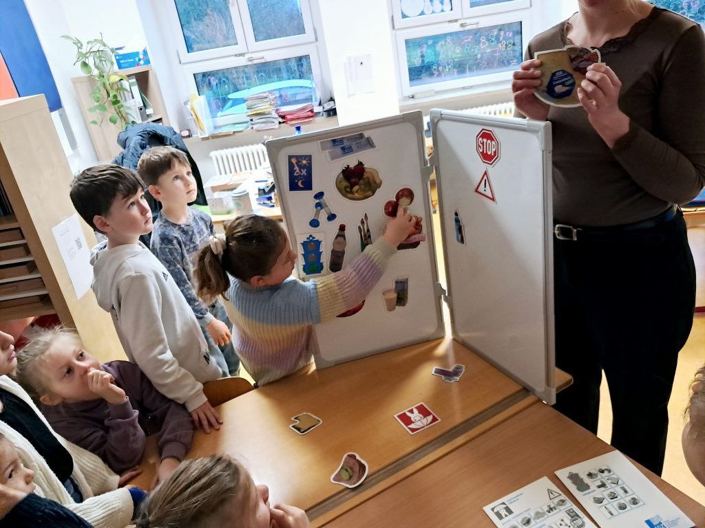 Beim Spiel ‚gut oder schlecht‘ ordneten die Kinder dann ganz begeistert verschiedene Lebensmittel an einer Magnettafel nach den Eigenschaften ‚gut für die Zähne‘ oder ‚schlecht für die Zähne‘.
